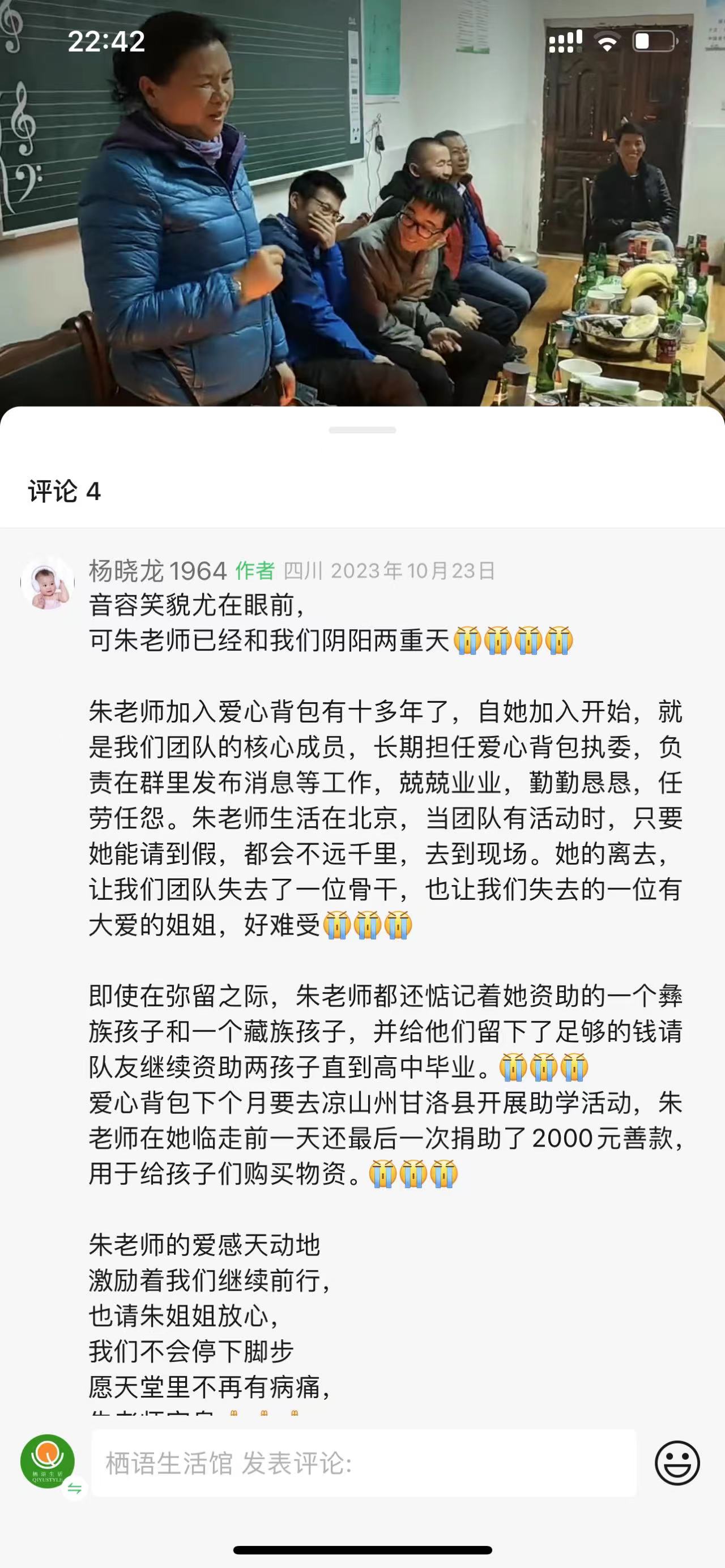 朱老师加入爱心背包有十多年了,自她加入开始,就是我们团队的核心成员,长期担任爱心背包执委,负责在群里发布消息等工作,兢兢业业,勤勤恳恳,任劳任怨。朱老师生活在北京,当团队有活动时,只要她能请到假,都会不远千里,去到现场。她的离去,让我们团队失去了一位骨干,也让我们失去的一位有大爱的姐姐,好难受。